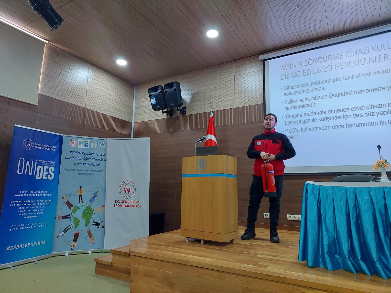 A Blok Konferans Salonunda gerçekleştirilen eğitime farklı fakülte ve bölümlerden birçok öğrenci yoğun ilgi gösterdi. Program, Sosyoloji Topluluğundan Ayşenur Yıldırım’ın Kartalkaya Yangın Faciası'nda hayatını kaybeden yurttaşları anmasıyla başladı. Sivil Savunma ve İtfaiyecilik Programı öğrencileri, yangın güvenliği konusunda önemli bilgileri dinleyicilerle paylaştı. Tolga Yiğit Arslan, yanma olaylarının temel boyutlarını ve söndürme-soğutma tekniklerini anlattı. Burak Kurt, yangın öncesinde alınması gereken önlemler hakkında detaylı bilgi verdi ve ev içi yangın risklerine dikkat çekti. Halil İbrahim Erdoğan, aktif ve pasif yangın sistemleri hakkında bilgilendirici bir sunum yaptı. Berkay Arif Tota, yangın dolaplarının kullanımını detaylandırdı. İsmail Yılmaz, yangın söndürme cihazlarının türlerini ve kullanım yöntemlerini teorik olarak aktardı.