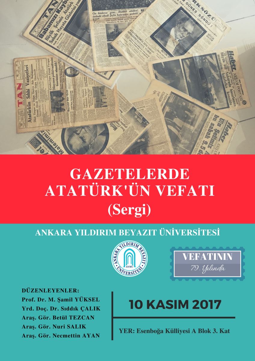 Gazi Mustafa Kemal Atatürk'ün vefatının 79. yılı hasebiyle bölümümüzde "Gazetelerde Atatürk'ün Vefatı" başlıklı bir sergi düzenlenecektir. 10 Kasım 2017 Cuma günü saat 10:00'da gerçekleştirilecek sergiye üniversitemiz idari ve akademik personeli ile tüm öğrencilerimiz davetlidir.