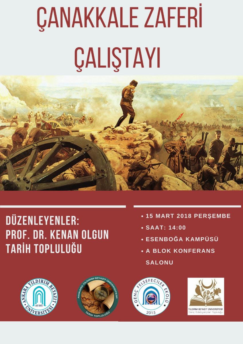 15 Mart Perşembe günü saat 14:00 de Bölümümüz öğretim üyeleri ve Tarih Topluluğu tarafından ortaklaşa gerçekleştirilecek olan 'Çanakkale Zaferi Çalıştayı'na değerli hocalarımız ve tüm öğrenci arkadaşlarımız davetlidir.
