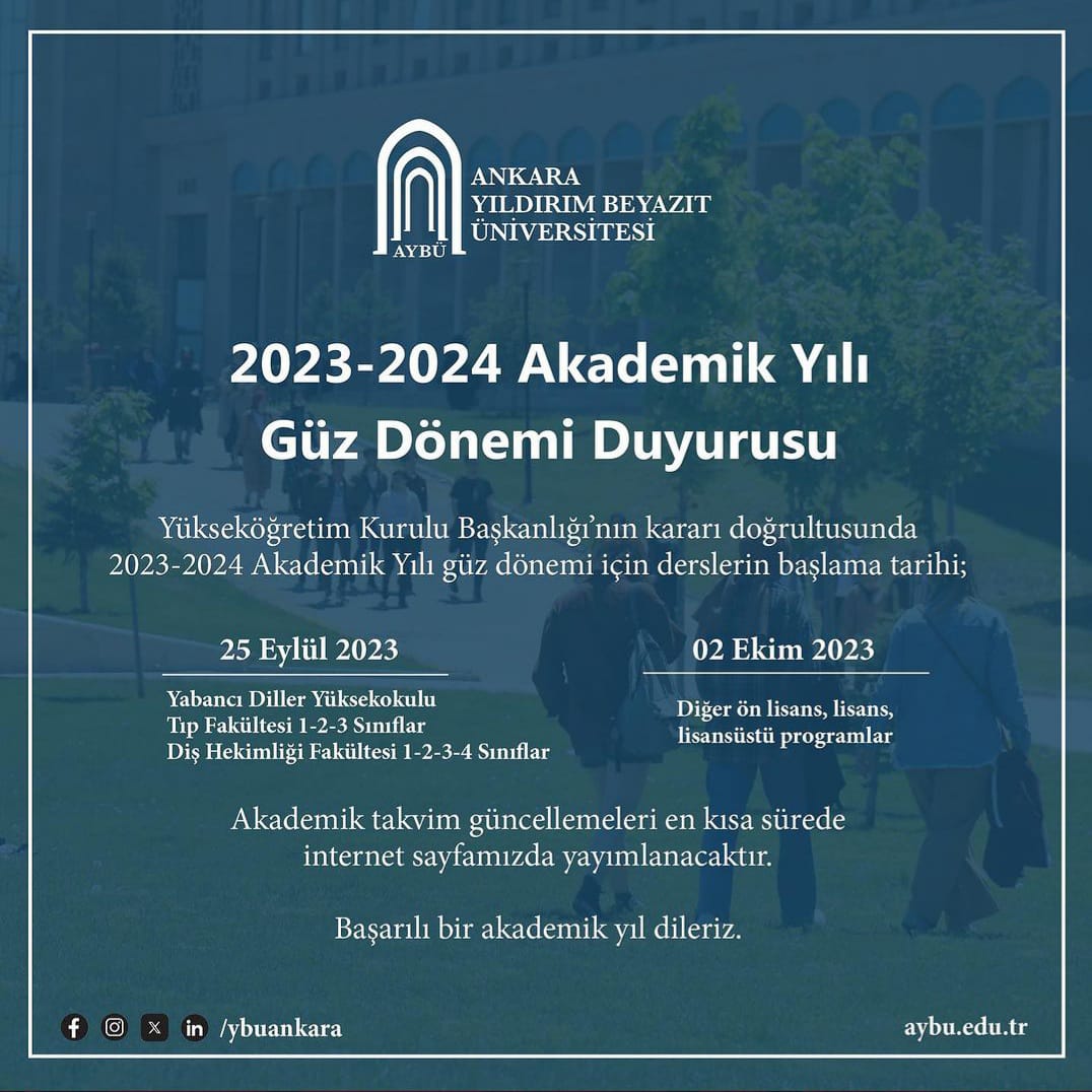 Önlisans, lisans ve lisansüstü programlar güz dönemi için ders başlama tarihi 2 Ekim 2023 olarak belirlenmiştir.