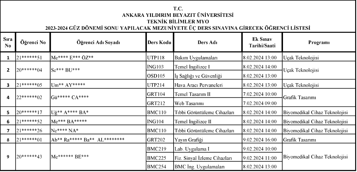 07-08-09 Şubat 2024 Tarihlerinde Yapılacak Olan Mezuniyete Üç Ders Sınav Programı