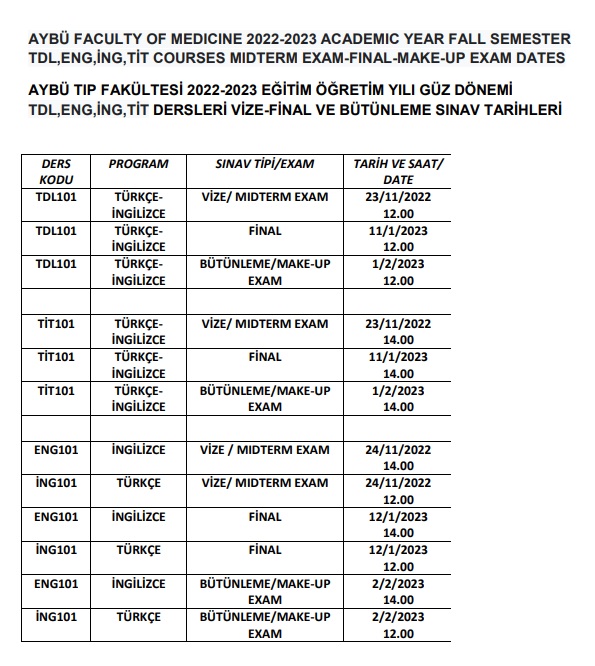 AYBÜ FACULTY OF MEDICINE 2022-2023 ACADEMIC YEAR FALL SEMESTER TDL,ENG,İNG,TİT COURSES MIDTERM EXAM-FINAL-MAKE-UP EXAM DATES AND CLASSROOMS