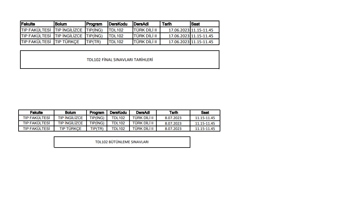 TDL 102 Türk Dili Final Exam and Make-Up Exam Dates