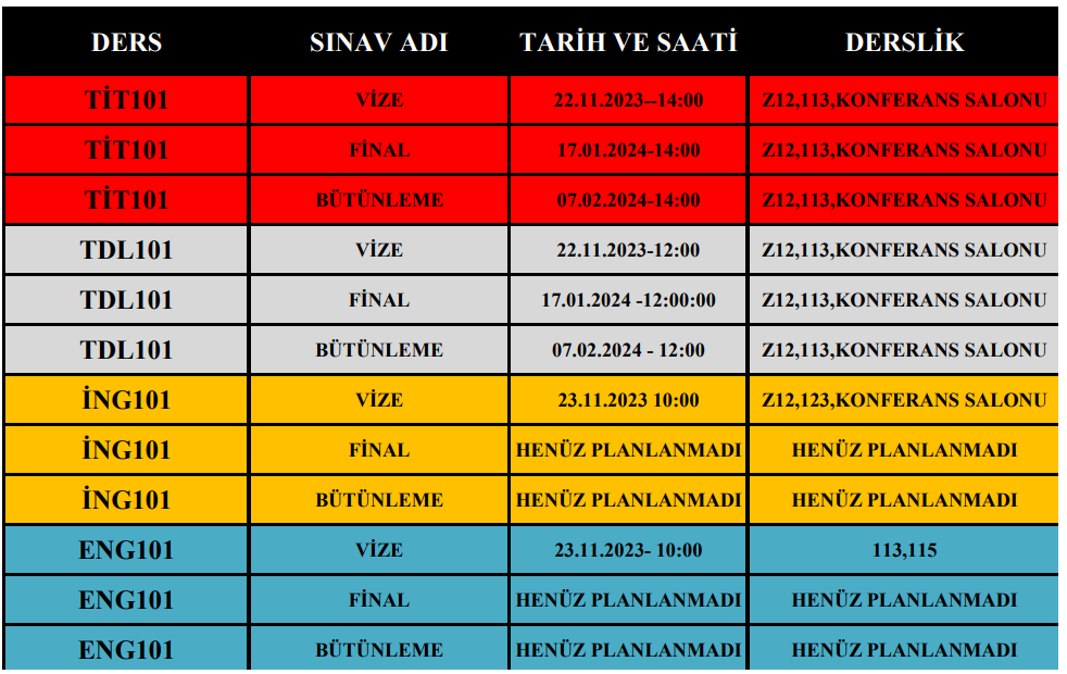 ABOUT TİT101, TDL101, İNG101, ENG101 COURSES (EXAM DATES, TIME AND CLASSROOMS)