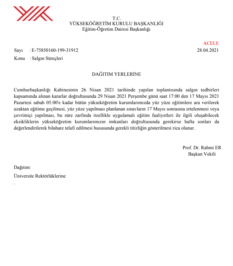 YÖK’nun ekteki yazısına istinaden COVID19 önlemleri kapsamında alınan karar gereğince 29.04.2021-17.05.2021 tarihleri arasında eğitiminize ara verilmiştir.