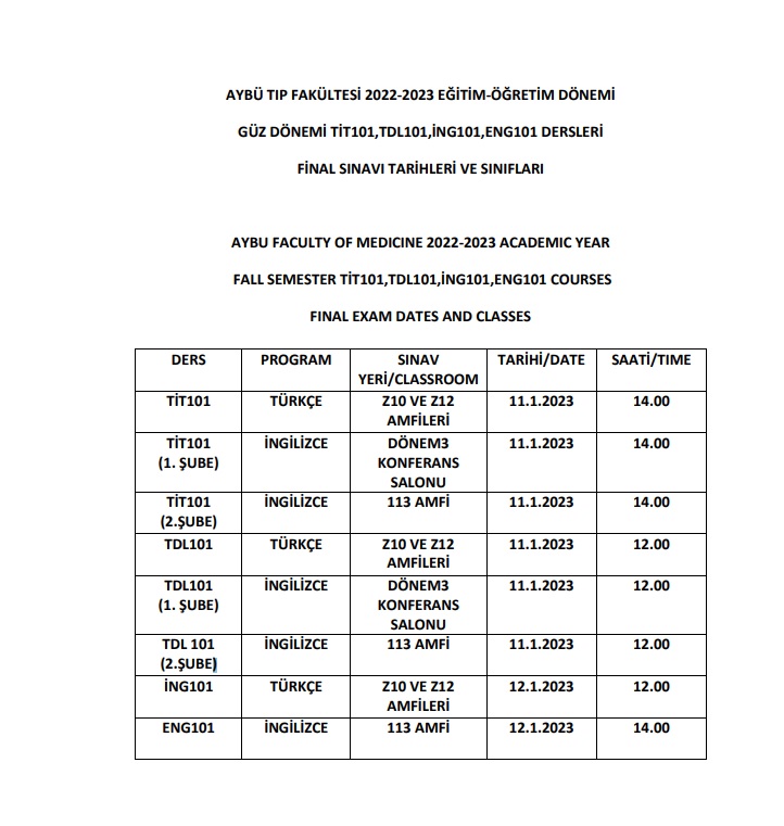AYBÜ TIP FAKÜLTESİ 2022-2023 EĞİTİM-ÖĞRETİM DÖNEMİ GÜZ DÖNEMİ TİT101,TDL101,İNG101,ENG101 DERSLERİ FİNAL SINAVI TARİHLERİ VE SINIFLARI