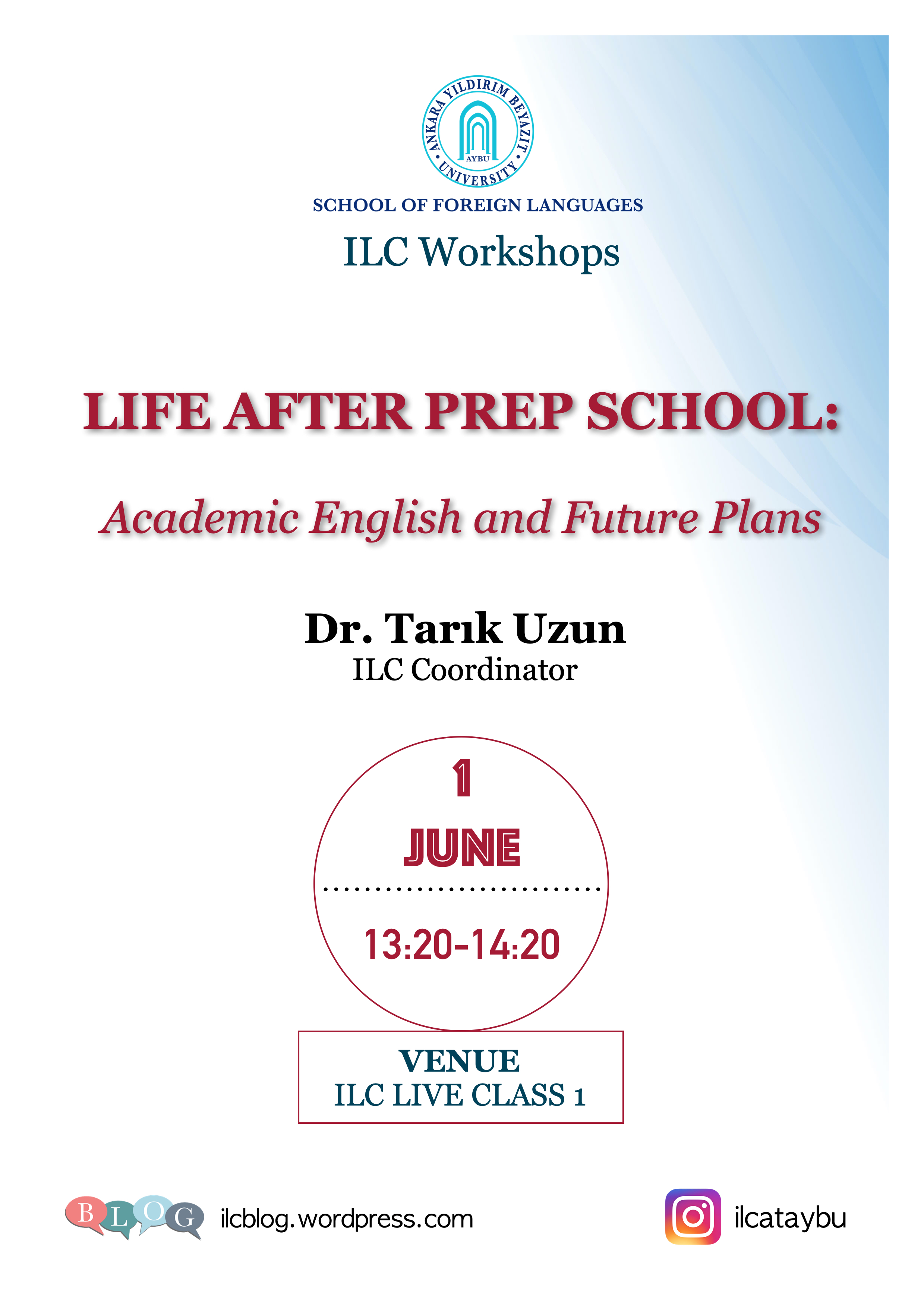 Yüksekokulumuz Bağımsız Öğrenme Merkezi (ILC) tarafından düzenlenen ILC Atölye Çalışmaları kapsamında Dr. Tarık Uzun tarafından, öğrencilerimizin hazırlık öğrenimlerinin ardından fakültelerinde başlayacakları akademik hayatlarına yönelik beklenti, gereksinim ve gelecek planlarının konuşulacağı bir toplantı gerçekleştirecektir. Etkinlikte ayrıca, öğrencilerin akademik ve mesleki gelişimlerinde İngilizcenin rolü ve akademik İngilizce konuları da ele alınacaktır. Etkinlik 1 Haziran 2021 tarihinde 13:20-14:20 saatleri arasında, ILC Live Class 1’de gerçekleştirilecektir.