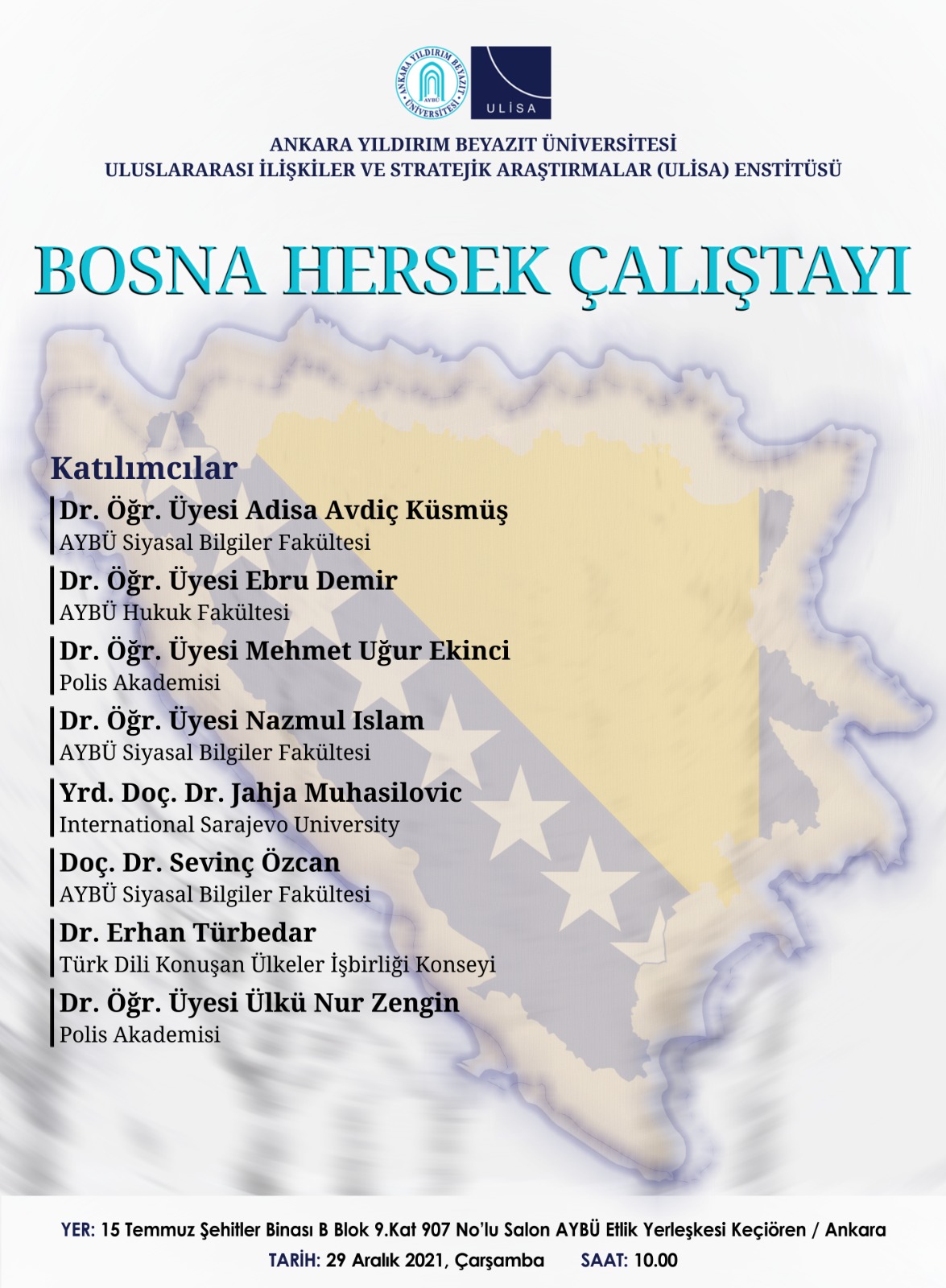 ULİSA tarafından Dr. Adisa Avdiç Küsmüş, Dr. Ebru Demir, Dr. Mehmet Uğur Ekinci, Dr. Md. Nazmul Islam, Dr. Jahja Muhasilovic, Doç. Dr. Sevinç Özcan, Dr. Erhan Türbedar ve Dr. Öğr. Üyesi Ülkü Nur Zengin'in katılımıyla "Bosna Hersek Çalıştayı" gerçekleştirilecektir.