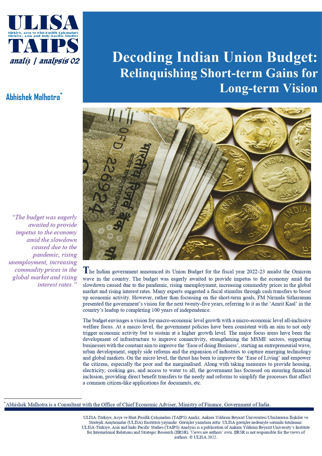 Hindistan Hükümeti Maliye Bakanlığı Ekonomi Başdanışmanlığı Ofisi'nde Danışman Abhishek Malhotra'ın "Hindistan Birliğinin Bütçesinin Şifresini Çözmek: ‎Kısa Vadeli Kazançlardan Vazgeçmek - Uzun Vadeli Vizyon" başlıklı analizi ULİSA-Türkiye, Asya ve Hint-Pasifik Çalışmaları (TAIPS) tarafından yayımlandı.