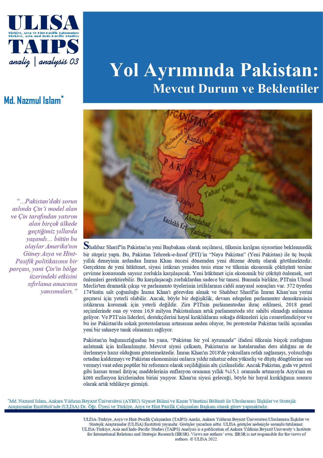 The analysis written by Ass. Prof. Dr. Md. Nazmul Islam, an Assistant Professor of Political Science in the Department of Political Science and Public Administration and Head of Turkiye, Asia and Indo-Pacific Studies, Institute for International Relations and Strategic Research (ULİSA) at the Ankara Yildirim Beyazit University (AYBU), Ankara, Turkey, has been published by ULİSA-Türkiye, Asia and Indo-Pacific Studies (TAIPS): "Pakistan at the Crossroad: Current Situation and Expectations"
