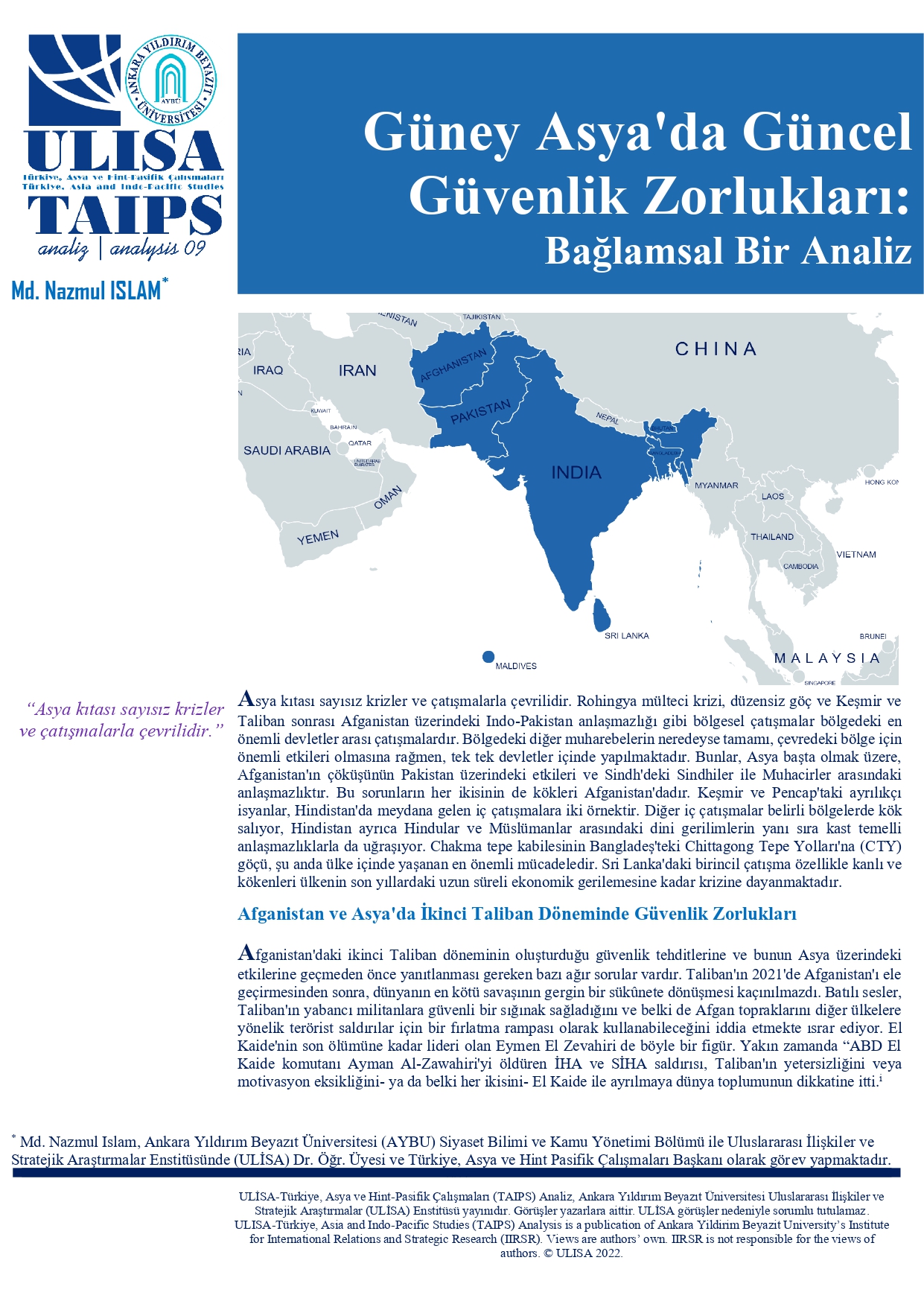 The analysis written by Ass. Prof. Dr. Md. Nazmul ISLAM, Political Science and Public Administration and Head of Turkiye, Asia and Indo-Pacific Studies, ULİSA at AYBÜ has been published by ULİSA-TAIPS: "Current Security Challenges in South Asia"