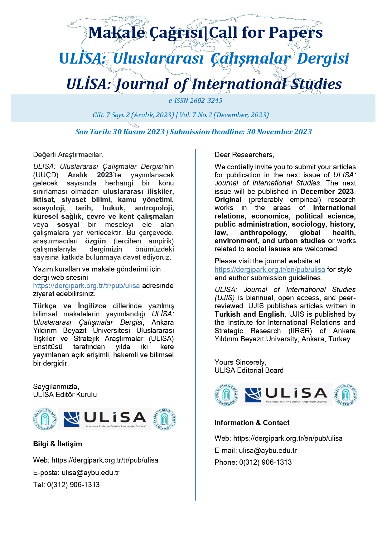 ULİSA: Uluslararası Çalışmalar Dergisi Aralık 2023 sayısı makale çağrısına buradan erişebilirsiniz.