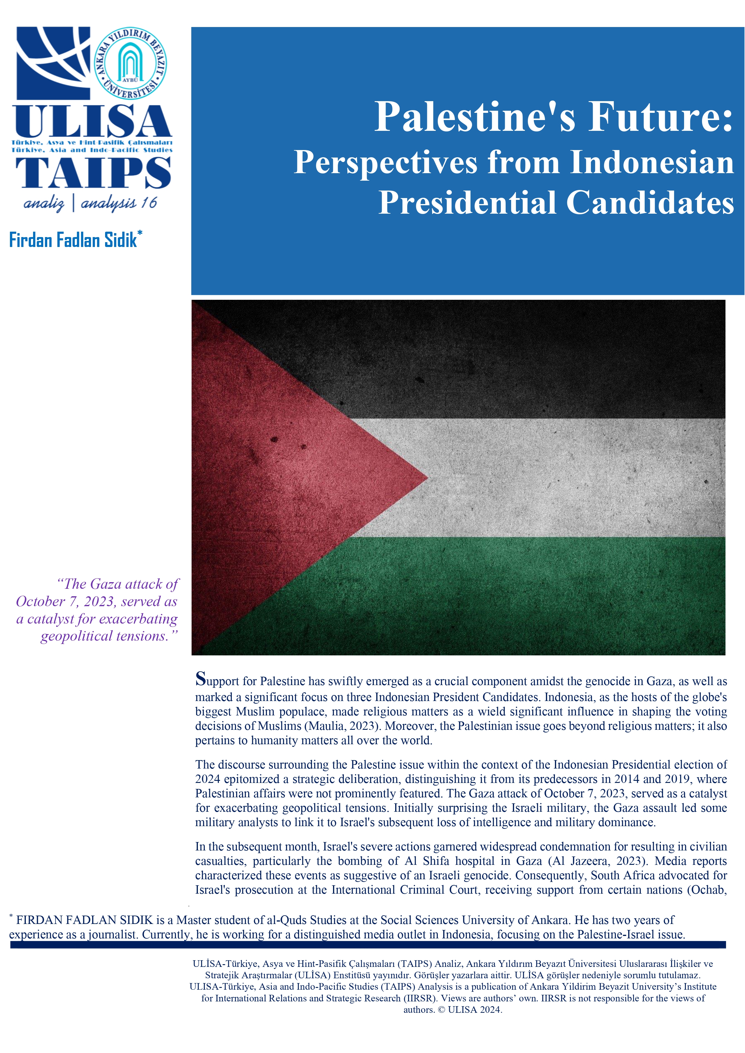 The analysis written by Firdan Fadlan SIDIK, master student of al-Quds Studies at the Social Sciences University of Ankara has been published by ULISA-TAIPS: “Palestine's Future: Perspectives from Indonesian Presidential Candidates”