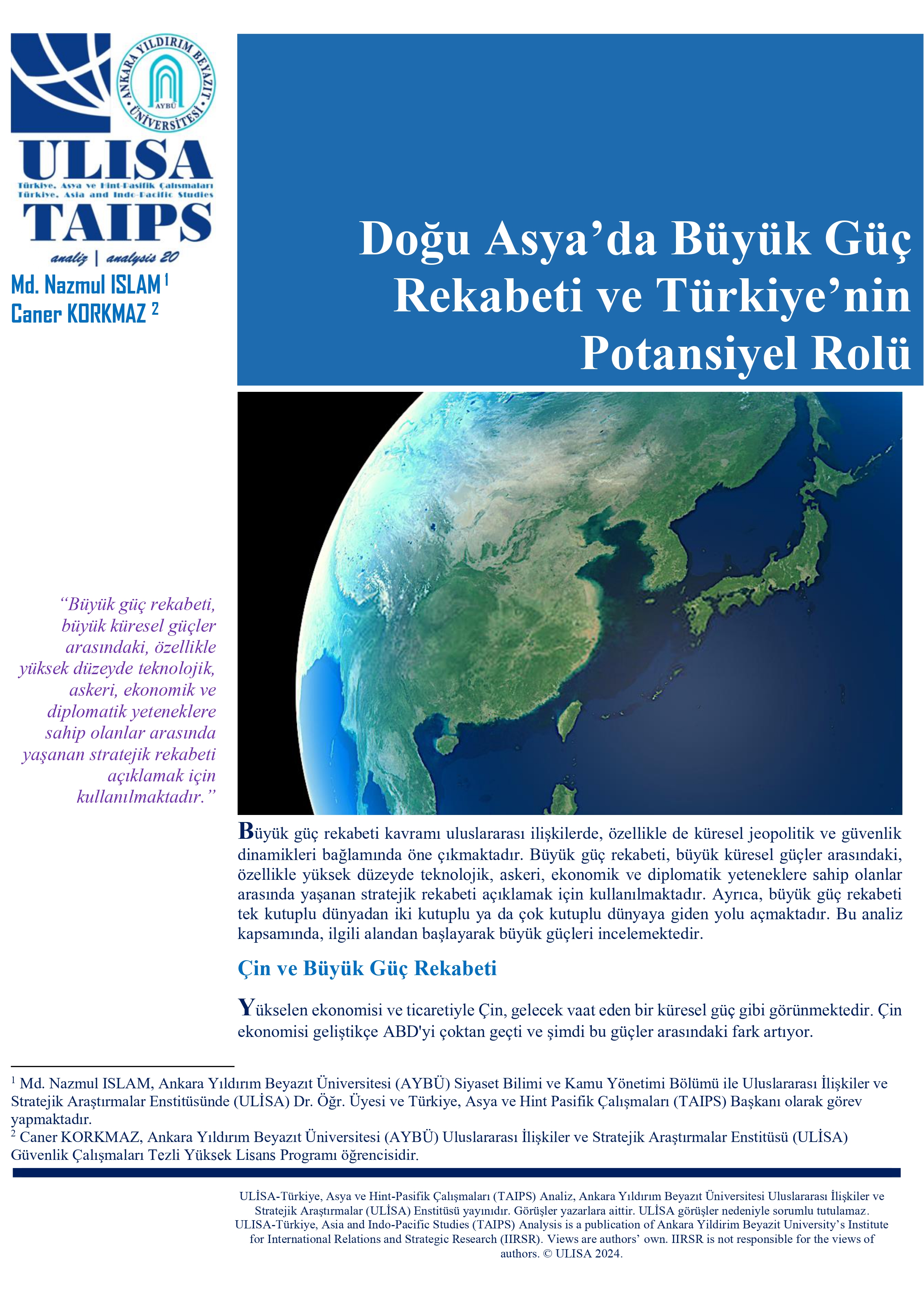 Dr. Öğr. Üyesi Md. Nazmul ISLAM ve Caner KORKMAZ’ın “Doğu Asya’da Büyük Güç Rekabeti ve Türkiye’nin Potansiyel Rolü” başlıklı analizi ULİSA-Türkiye, Asya ve Hint-Pasifik Çalışmaları (TAIPS) tarafından yayımlandı.