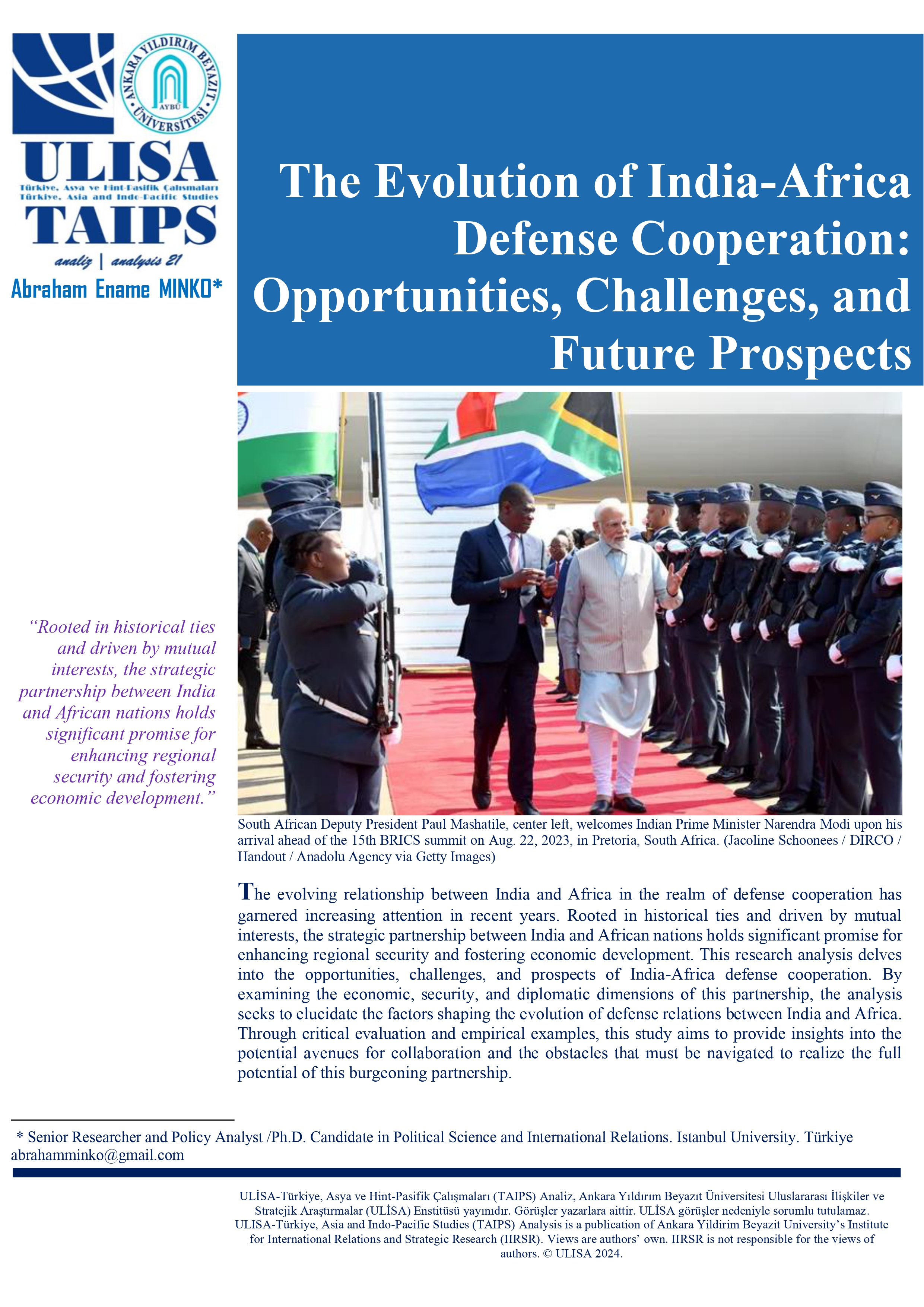 The analysis authored by Abraham Ename Minko has been published by ULISA-Türkiye, Asia and Indo-Pacific Studies (TAIPS): “The Evolution of India-Africa Defense Cooperation: Opportunities, Challenges, and Future Prospects”