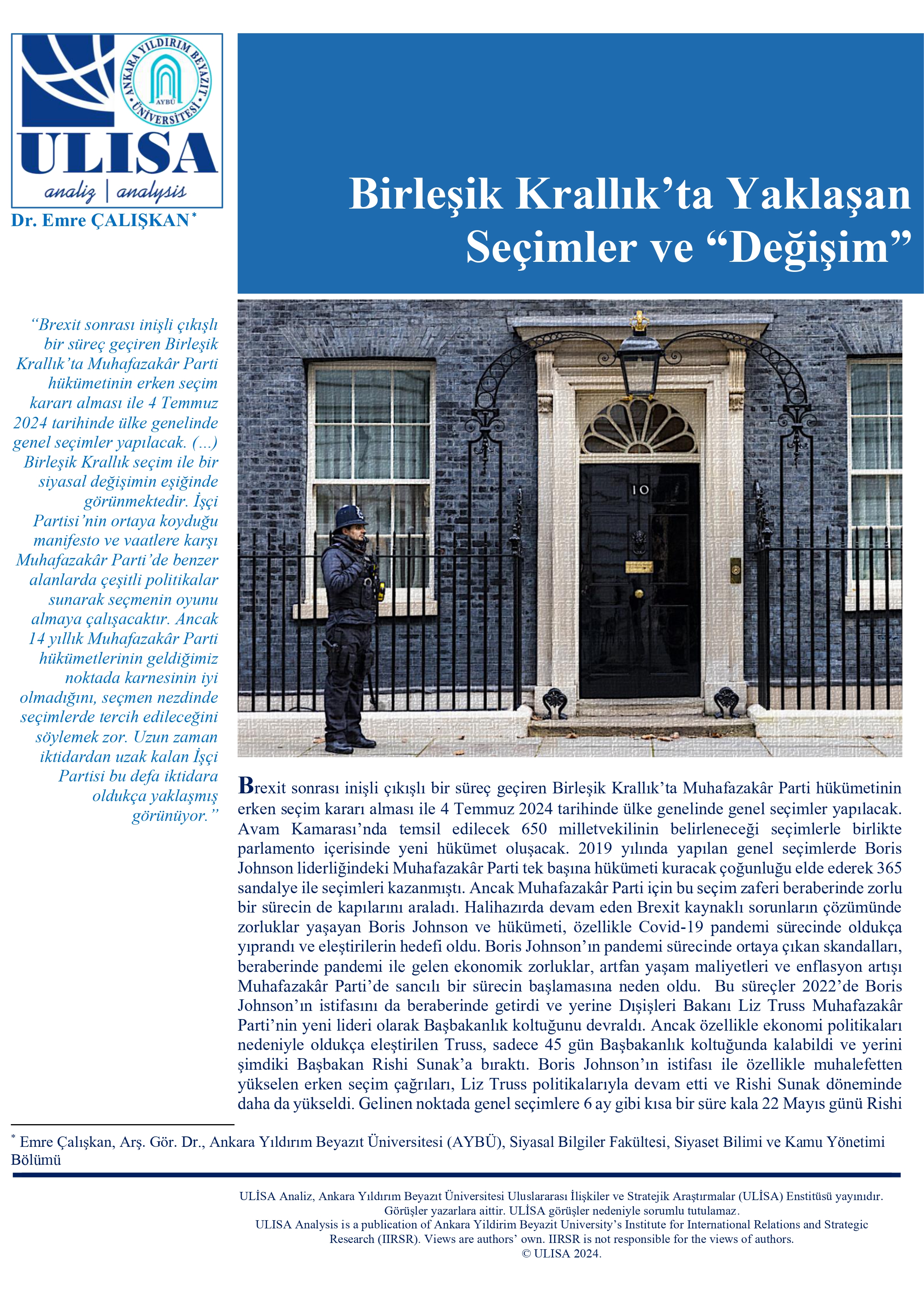 AYBÜ Siyasal Bilgiler Fakültesi Siyaset Bilimi ve Kamu Yönetimi Bölümü Araştırma Görevlisi Dr. Emre Çalışkan'ın "Birleşik Krallık’ta Yaklaşan Seçimler ve Değişim" başlıklı analizi ULİSA tarafından yayımlandı.