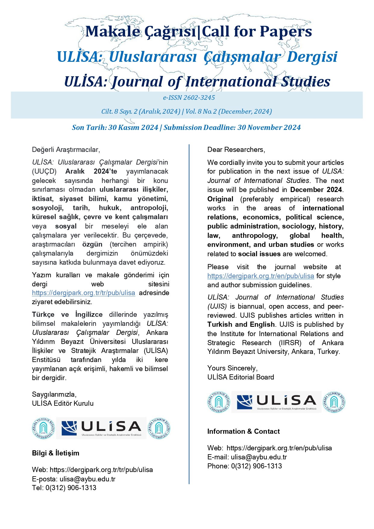 ULİSA: Uluslararası Çalışmalar Dergisi’nin Aralık 2024’te yayımlanacak sayısında çeşitli konu ve alanlarda çalışmalara yer verilecektir. Araştırmacıları katkıda bulunmaya davet ediyoruz.