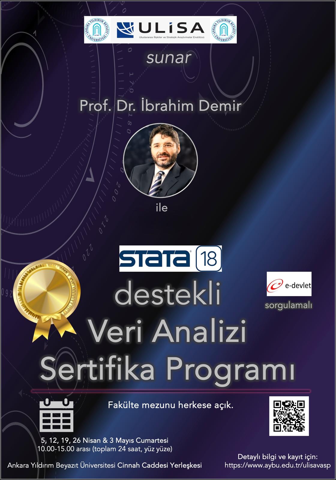 Programın Amacı: Ankara Yıldırım Beyazıt Üniversitesi Senatosu'nun 21/01/2025 tarihli ve 2025/02/05 sayılı kararıyla açılan sertifika programının amacı, yazılım (STATA) destekli temel sayısal veri analizi eğitimi sunmaktır. Program; sayısal veri analizi kullanım yerlerini tartışmak, veri çeşitlerini açıklamak, temel düzeyde STATA yazılımını veri yönetimi ve veri analizi bakımından tanıtmak, veri yönetimi, modelleme ve veri analizi eğitimlerini uygulamalı bir şekilde sunmaktır.