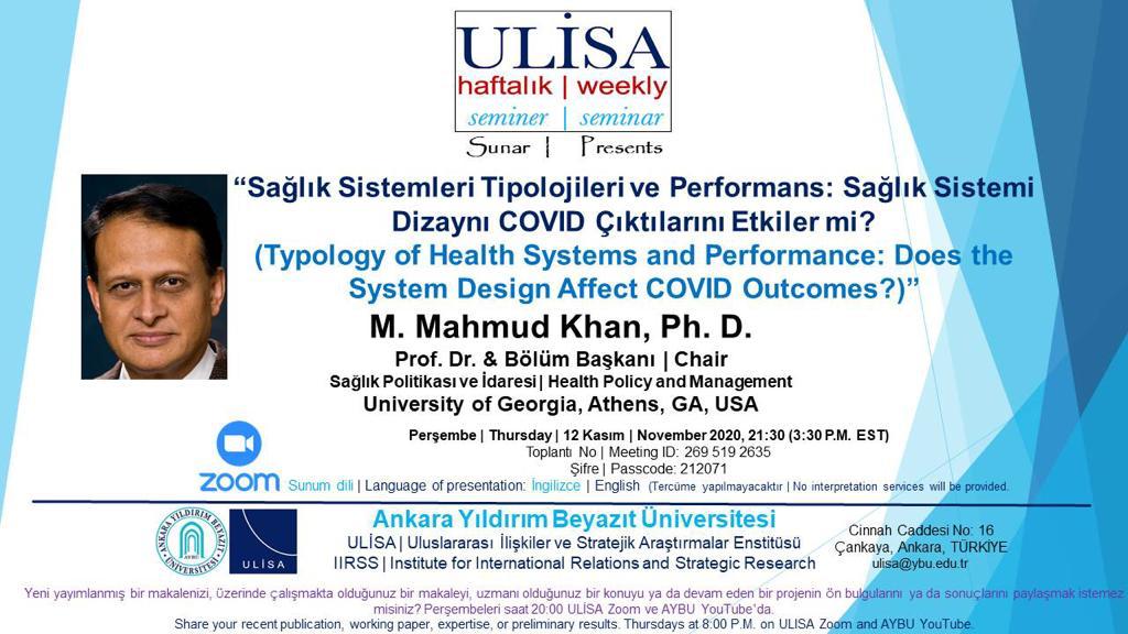 12.11.2020 Perşembe günü saat 20:00'da Zoom platformu üzerinden "Sağlık Sistemleri Tipolojileri ve Performans: Sağlık Sistemi Dizaynı COVİD Çıktılarını Etkiler mi?" başlıklı seminer düzenlenecektir.