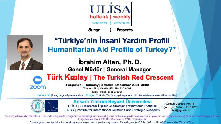 03.12.2020 Perşembe günü saat 20:00'da Zoom platformu üzerinden "Türkiye'nin İnsani Yardım Profili" başlıklı seminer düzenlenecektir.