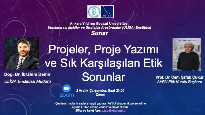 02.12.2020 Çarşamba günü saat 20:00'da Zoom platformu üzerinden "Projeler, Proje Yazımı ve Sık Karşılaşılan Etik Sorunlar" başlıklı bilgilendirme toplantısı düzenlenecektir.