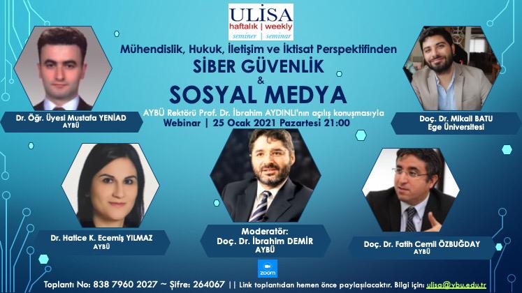 25.01.2020 Pazartesi günü saat 21:00'da Zoom platformu üzerinden "Mühendislik, Hukuk, İletişim ve İktisat Perspektifinden Siber Güvenlik ve Sosyal Medya" başlıklı seminer düzenlenecektir.