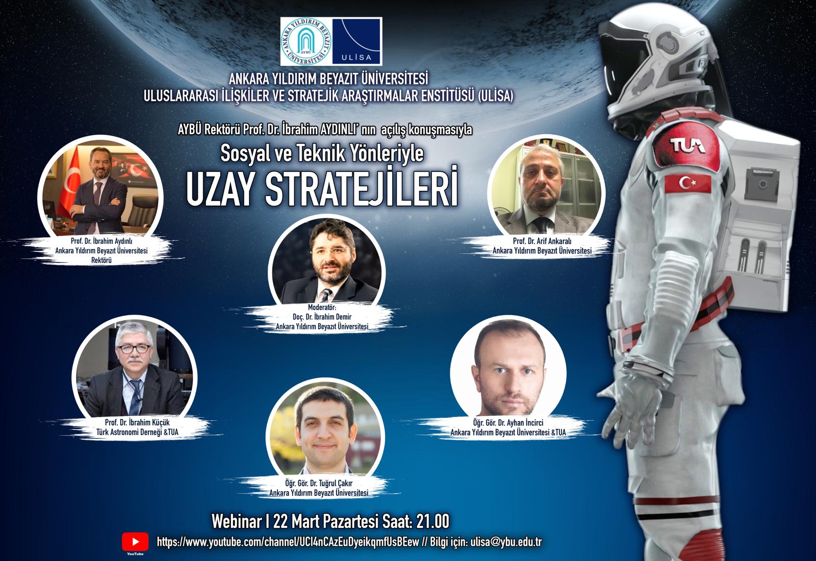 22.03.2021 Perşembe günü saat 21:00'da AYBÜ Youtube kanalında ULİSA tarafından "Sosyal ve Teknik Yönleriyle Uzay Stratejileri" başlıklı webinar düzenlenecektir.