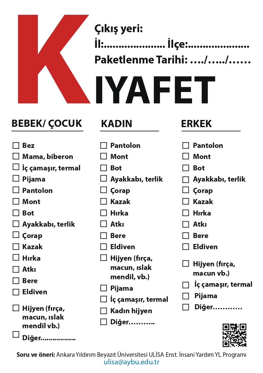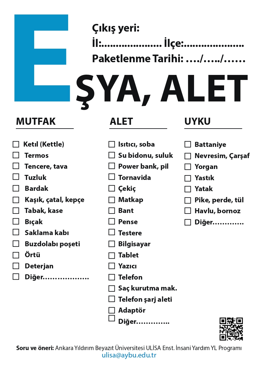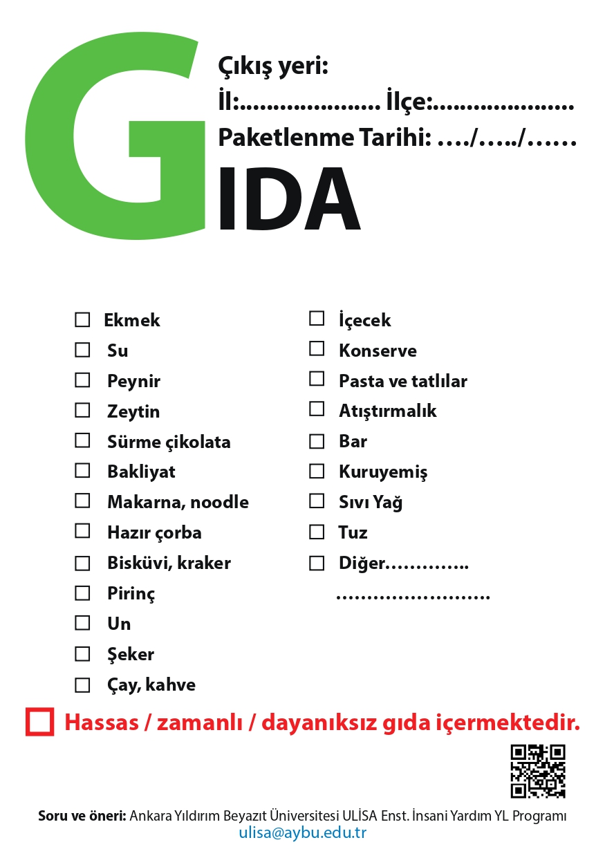 Yardım lojistiğindeki yığılma ve tıkanıklıkları azaltma adına yardım kolilerinin kaynağında tasnifi ve içerik listesi önem arz etmektedir. Yardım koli/poşet/çuvalları için aşağıdaki etiketlerin yazdırılıp yapıştırılması maliyetleri azaltacaktır.